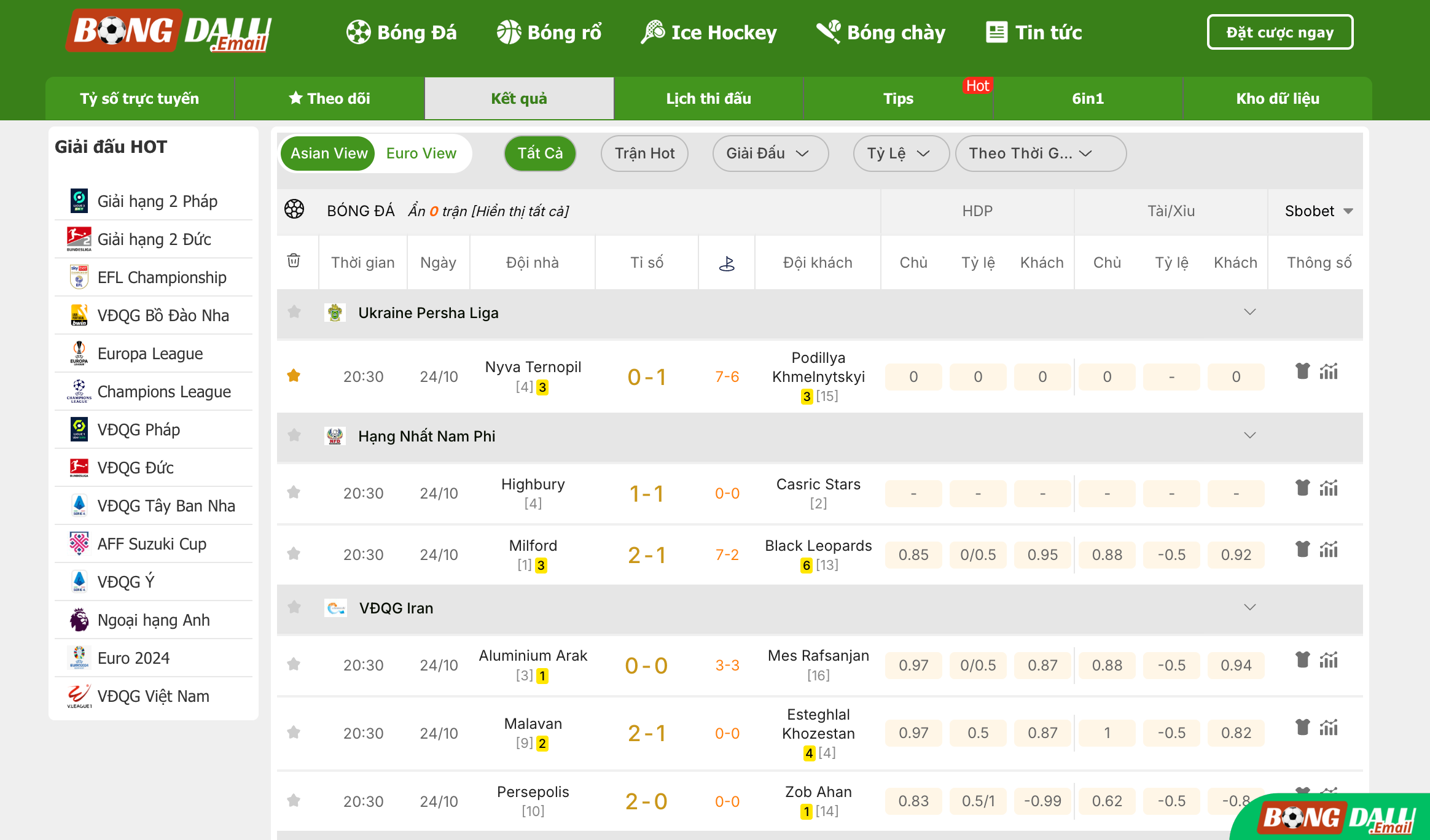 | Bóng đá Ẩn trận [Hiển thị tất cả] | HDP | Tài xỉu |